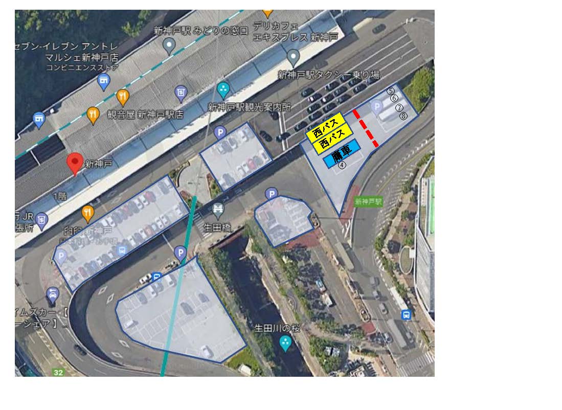 新神戸駅前のバス専用駐車場におきまして、GW期間中の高速線の庸車運行の関係で、以下の期間は1番、2番、3番の車室は利用いただけません。
