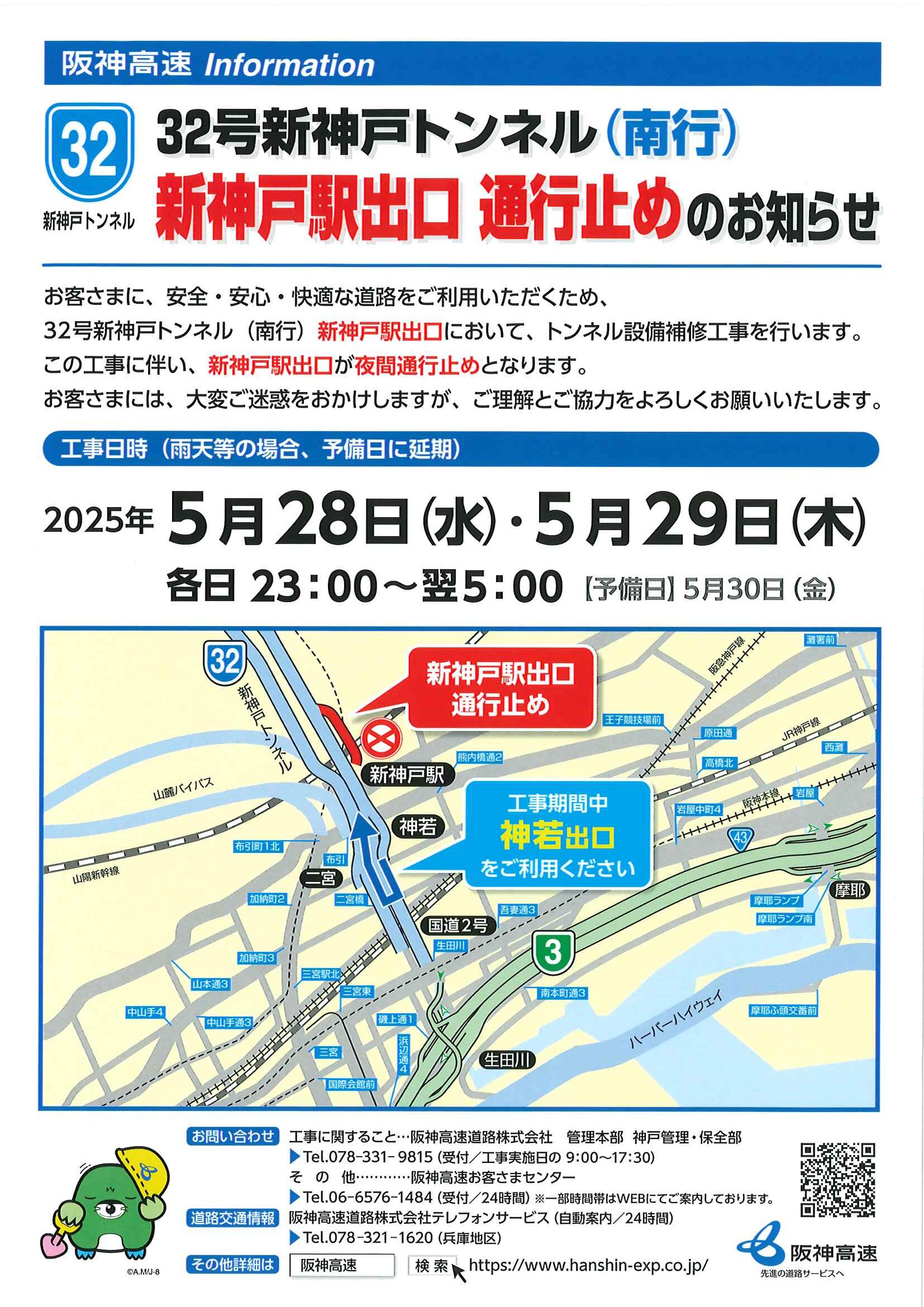 32号新神戸トンネル(南行)新神戸駅出口通行止めのお知らせ