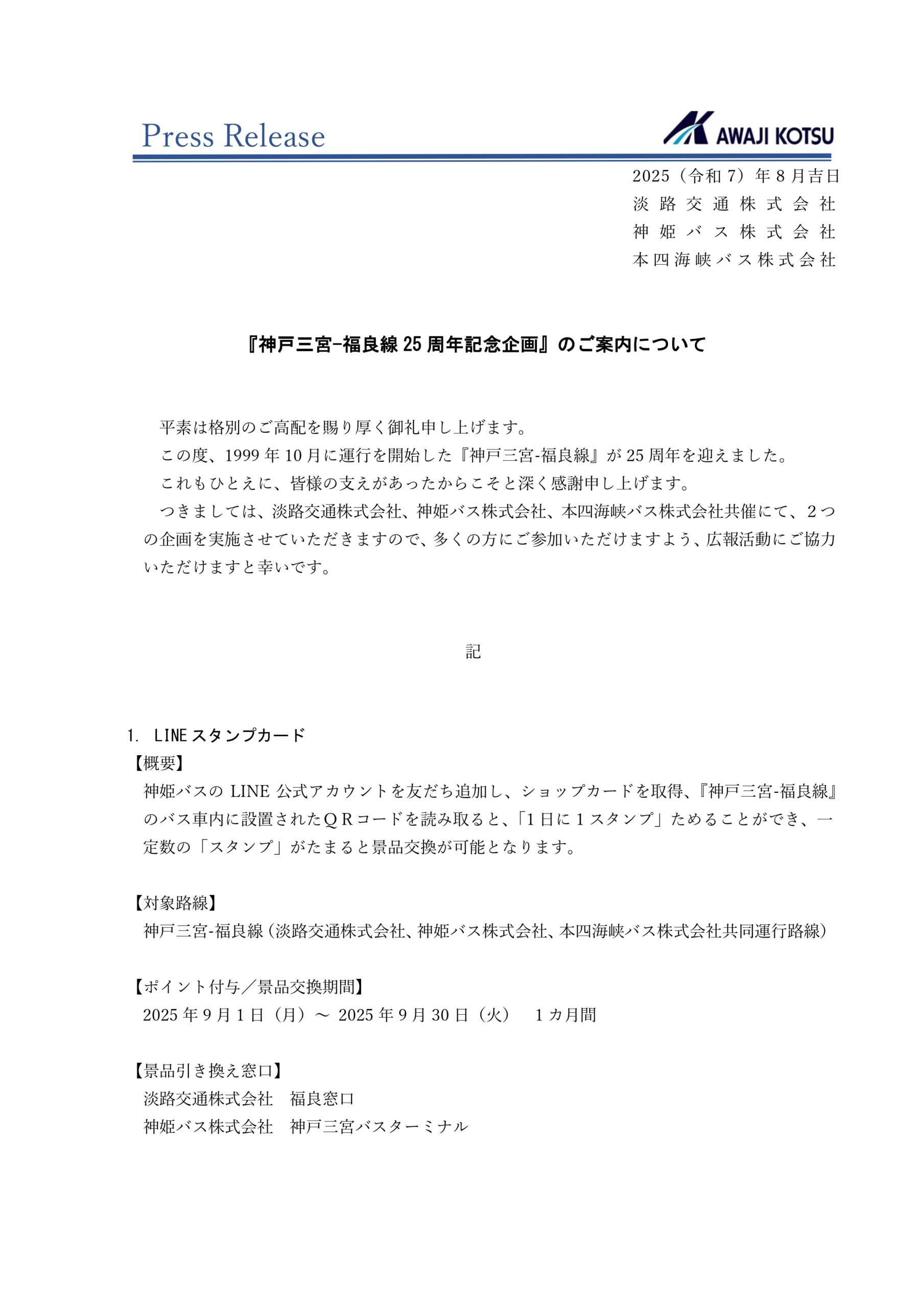 この度、淡路交通・神姫バス・本四海峡バスでは、1999年10月に運行開始した『神戸三宮-福良線』が25周年を迎えたことから、日頃からバスをご利用くださる皆さまへの感謝の気持ちを込めて『LINEスタンプカード企画』と『SNSフォトコンテスト』を開催いたします。