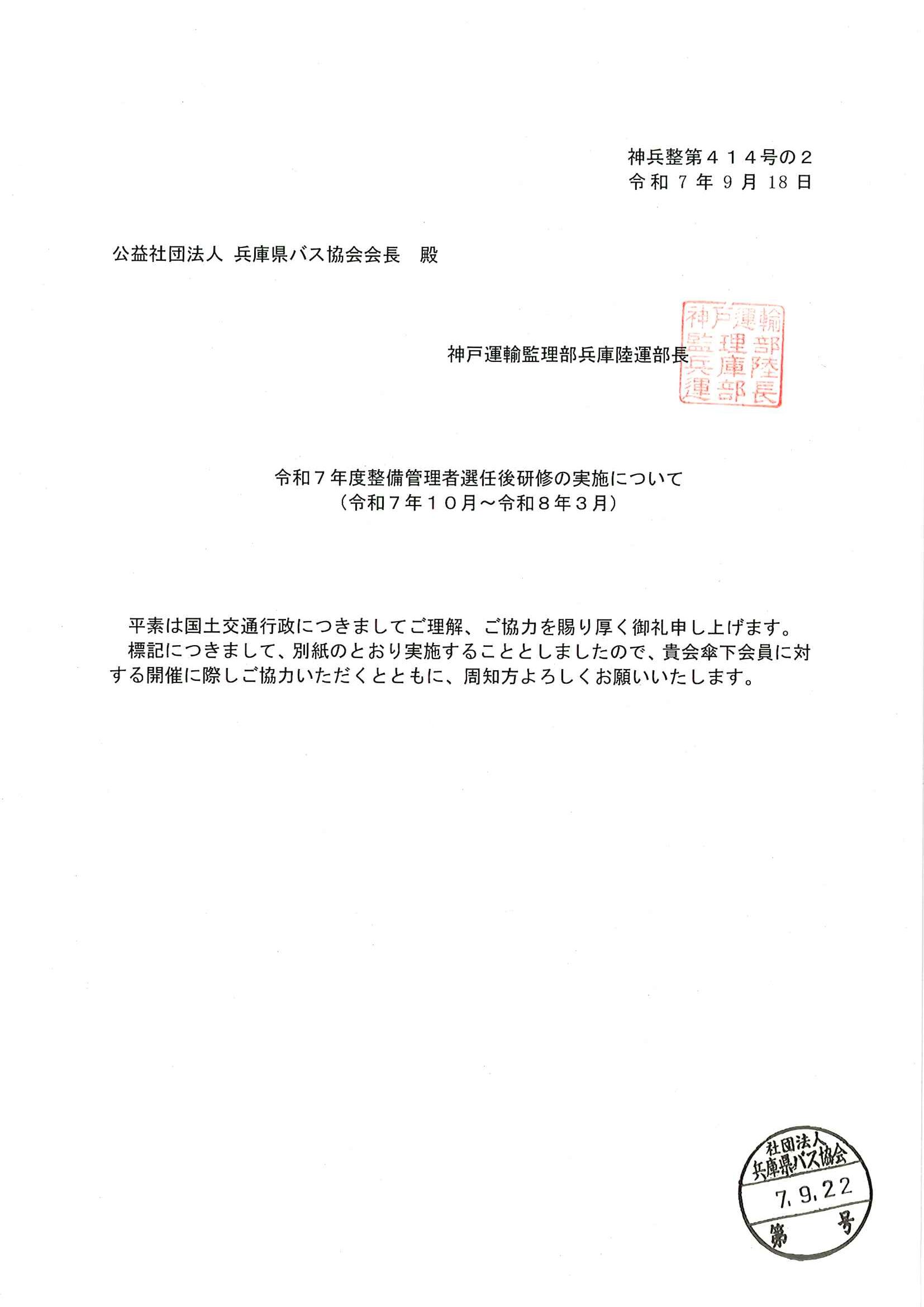 令和7年度整備管理者選任後研修の実施について(令和7年10月~令和8年3月)神戸運輸監理部兵庫陸運部長公示