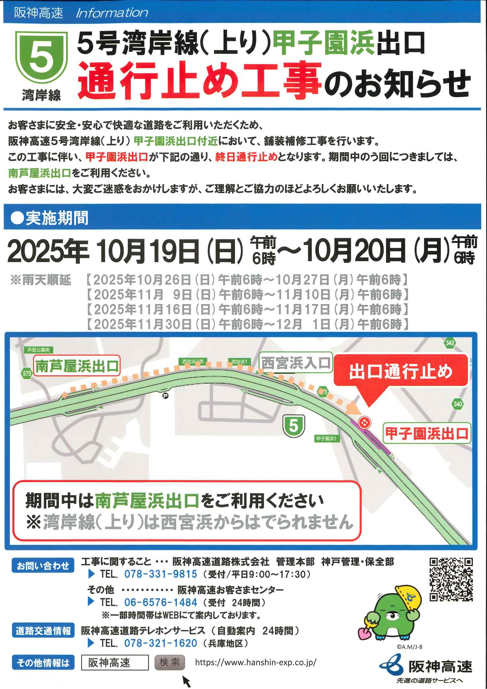 ホーム > お知らせ > 会員の皆様へ > 5号湾岸線(上り)甲子園浜出口通行止め工事のお知らせ