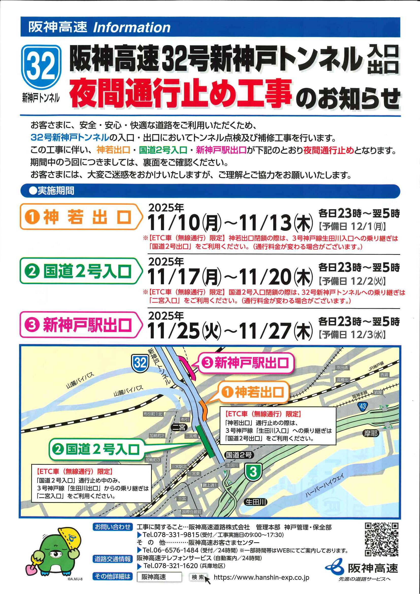 阪神高速32号線 新神戸トンネル入口出口夜間通行止めのお知らせ