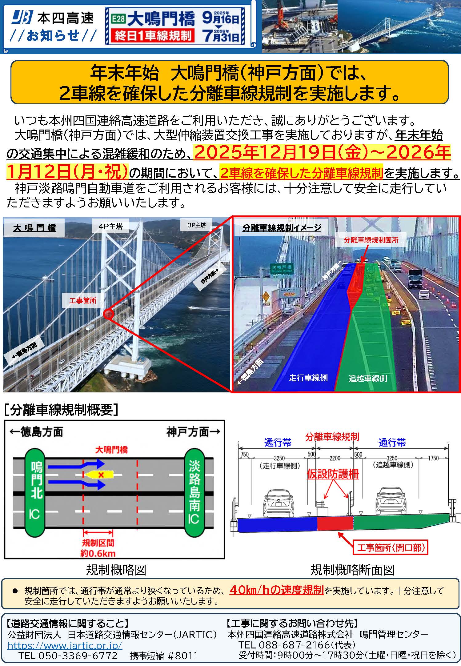 年末年始 大鳴門橋(神戸方面)での2車線を確保した分離車線規制実施について