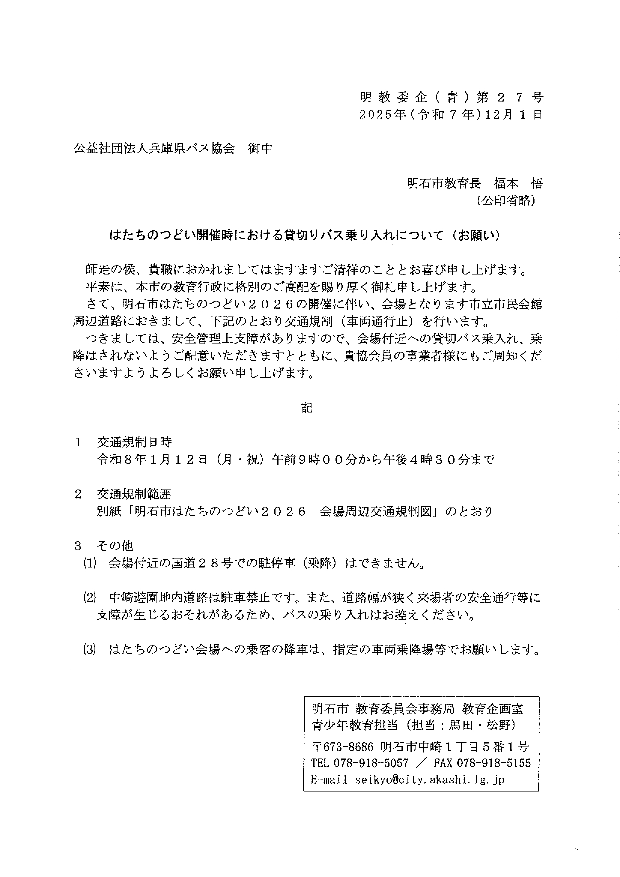 明石市「はたちのつどい2026」開催時の貸切バス乗り入れについて