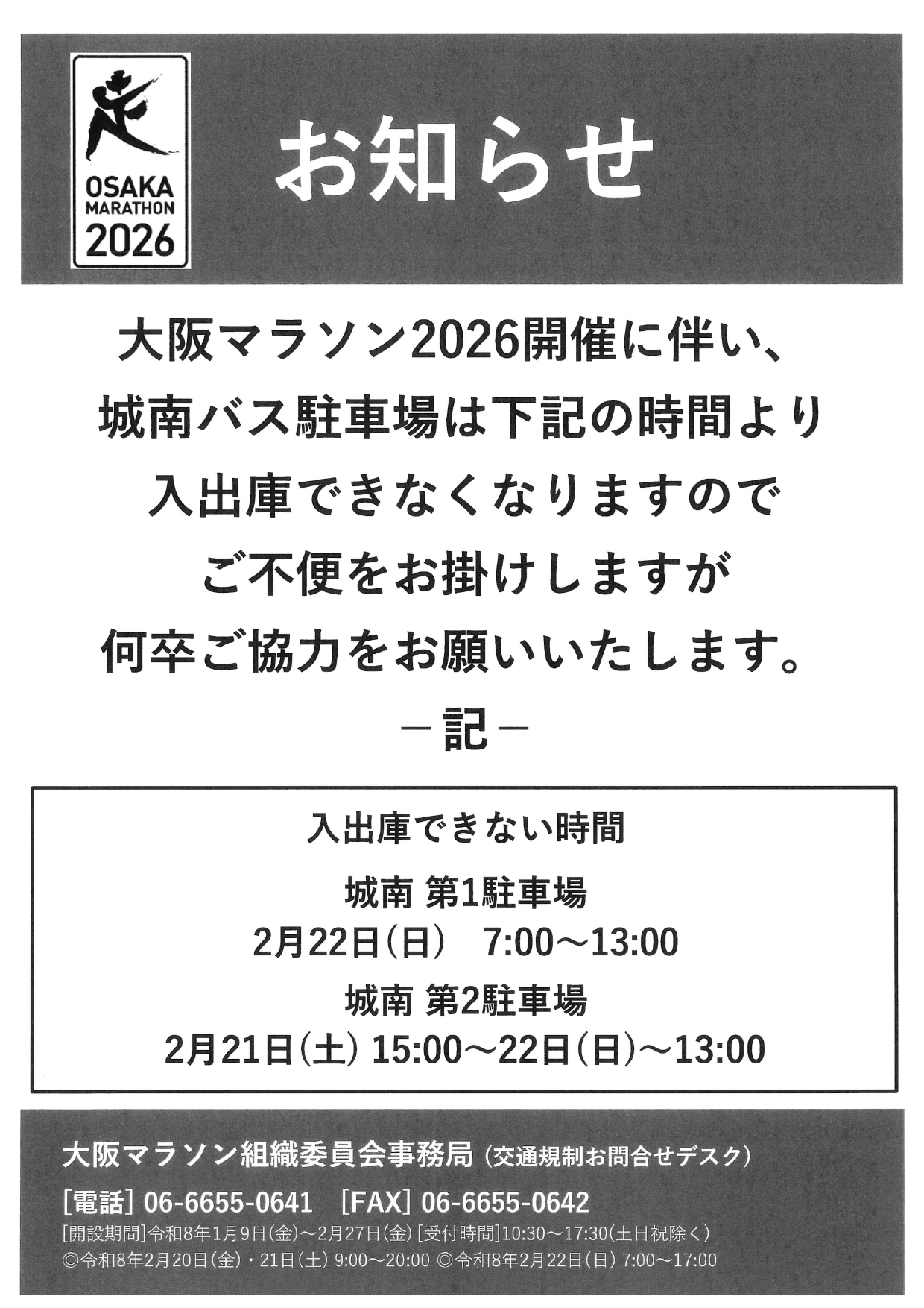 2026大阪マラソンに伴う駐車場使用規制案内