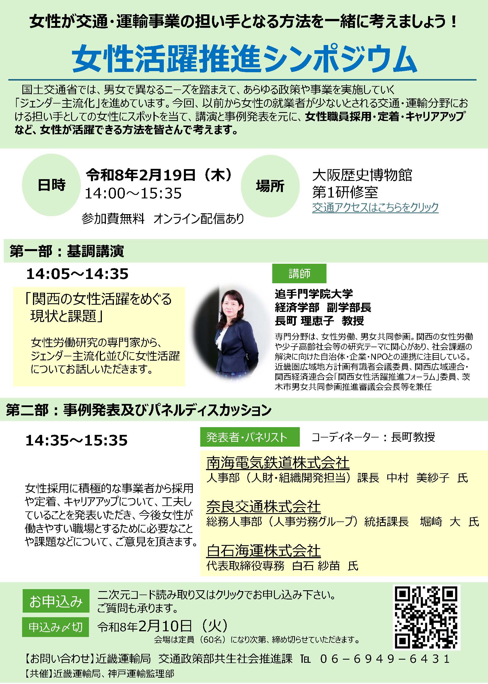 今回、以前から女性の就業者が少ないとされる交通・運輸分野における、担い手としての女性にスポットを当て、講演と事例発表を元に、女性職員採用・定着・キャリアアップなど、女性が活躍できる方法を皆さんで考えるシンポジウムを実施いたします。