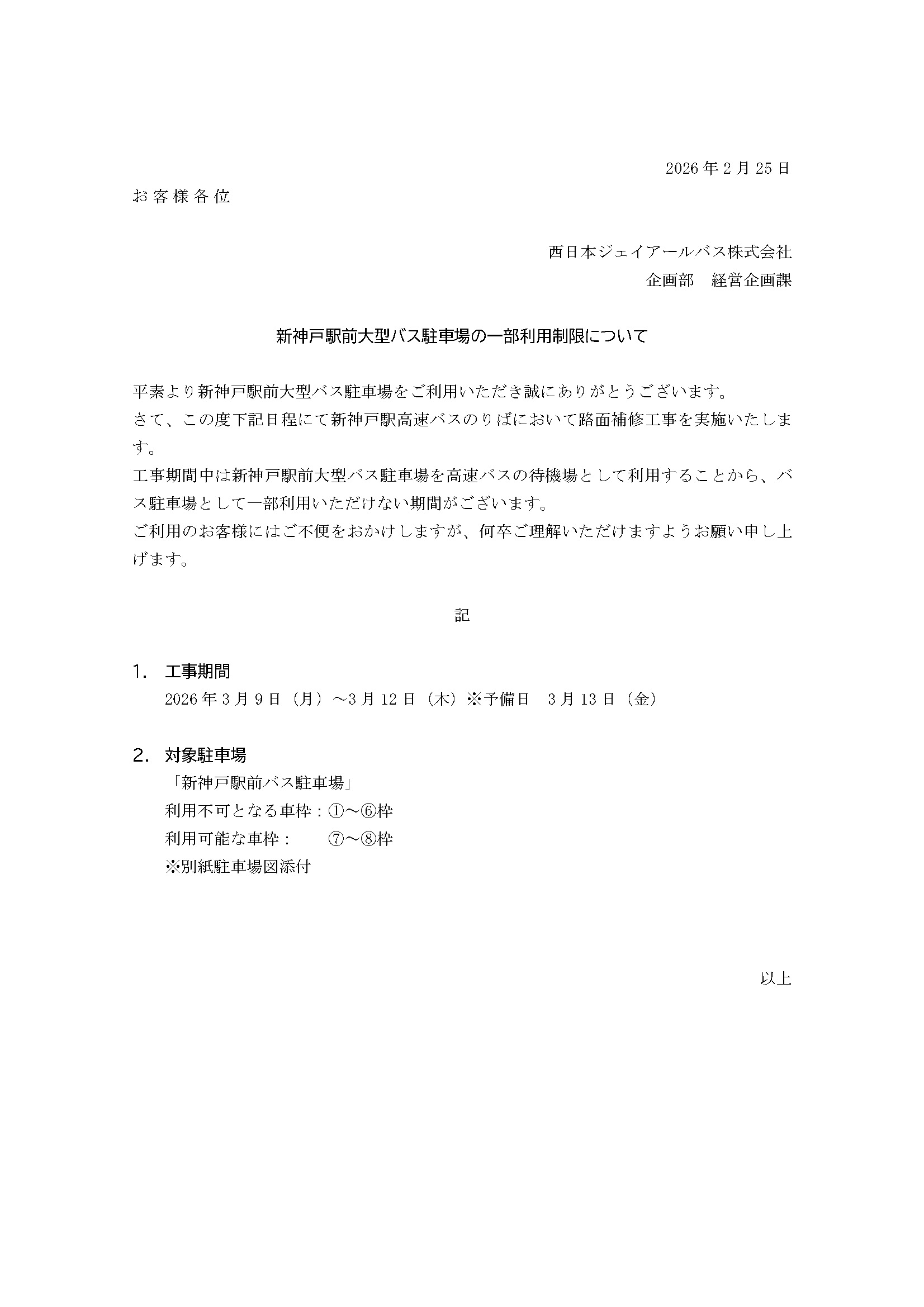 新神戸駅前大型バス駐車場の一部使用制限について