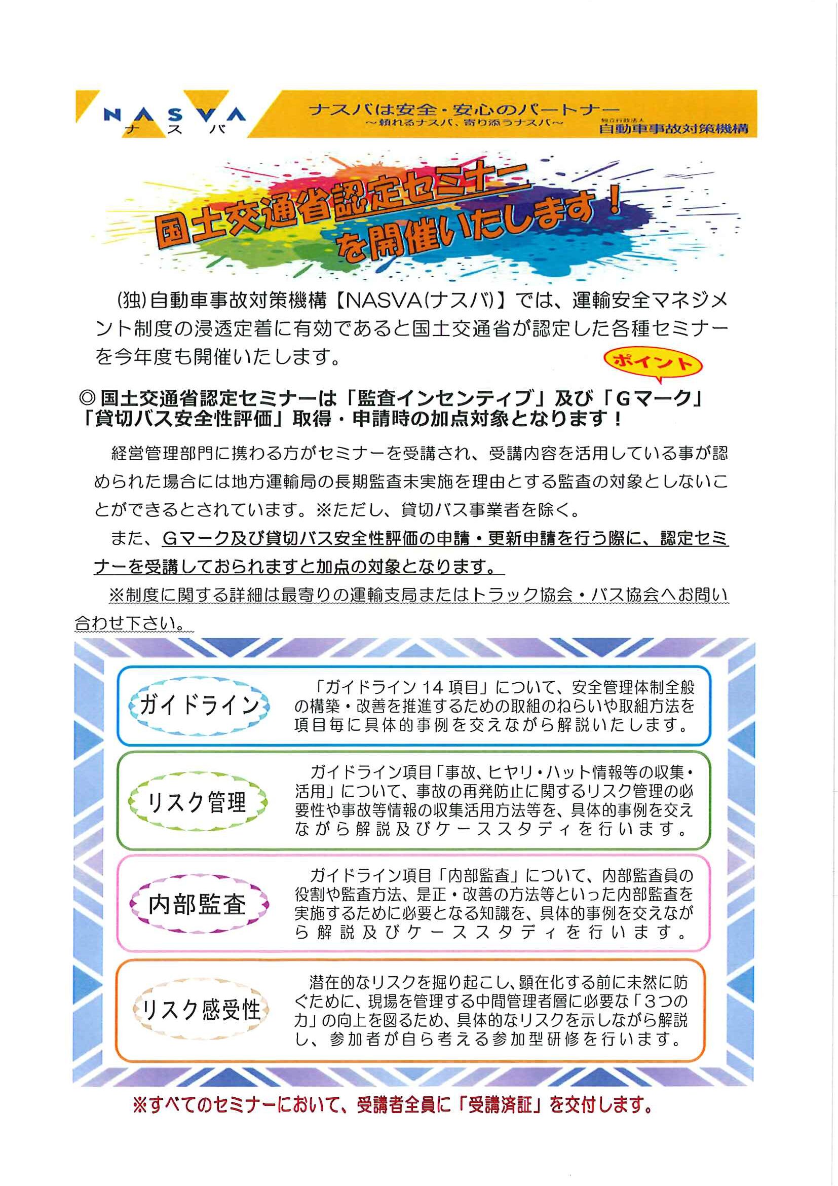 (独)自動車事故対策機構(NASVAナスバ)では、運輸安全マネジメント制度の浸透定着に有効であると国土交通省が認定した各種セミナーを、今年度も開催いたします。